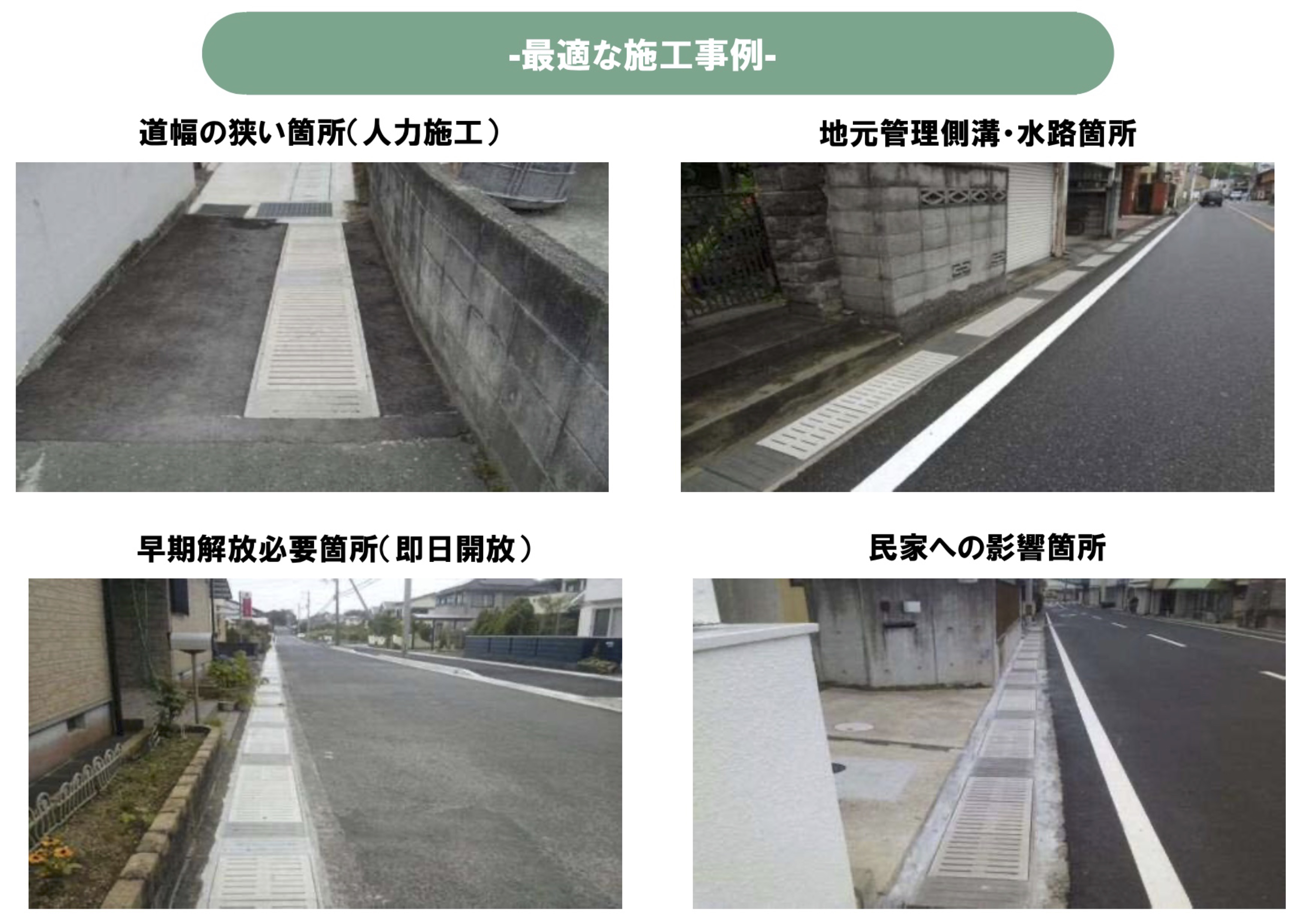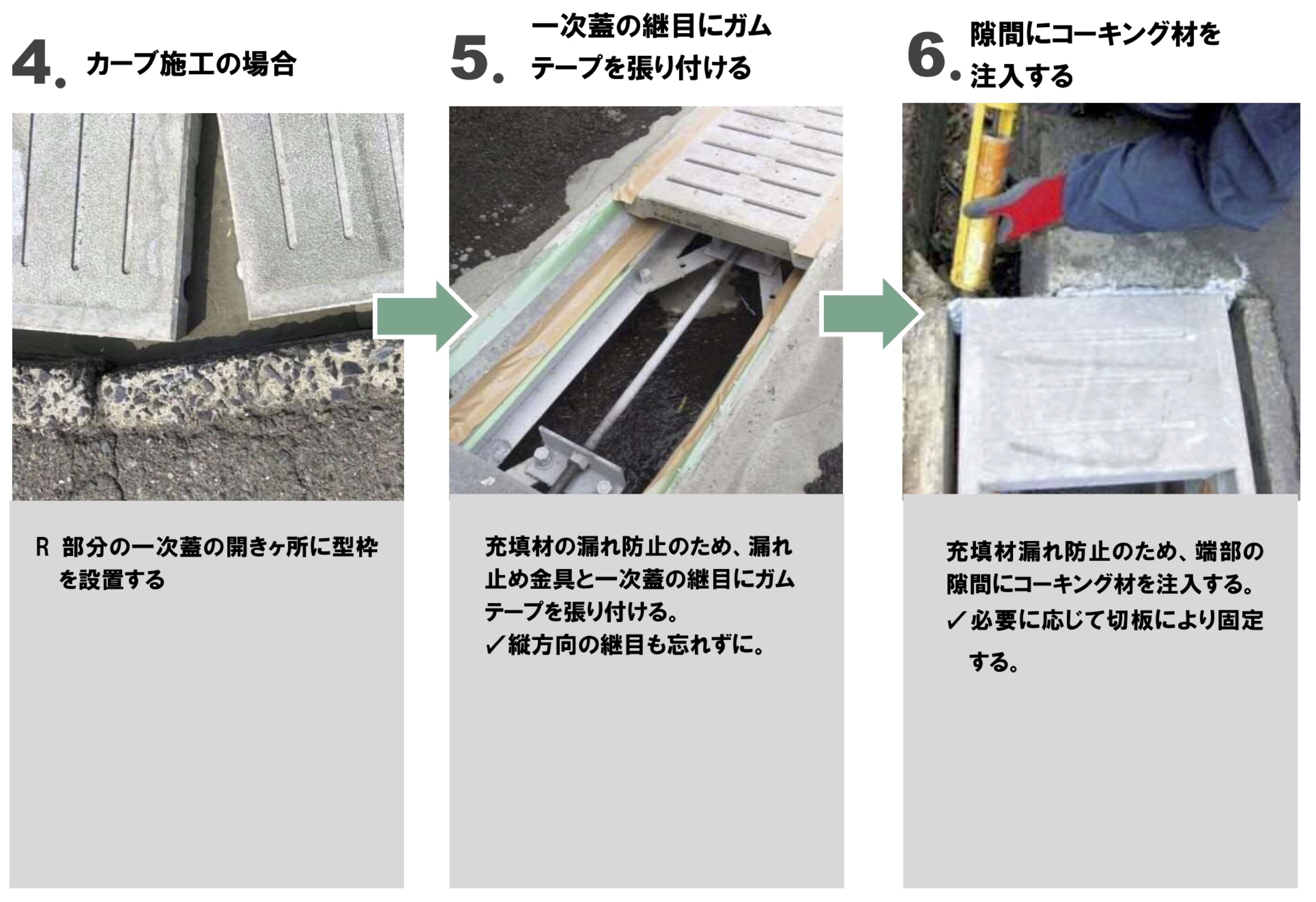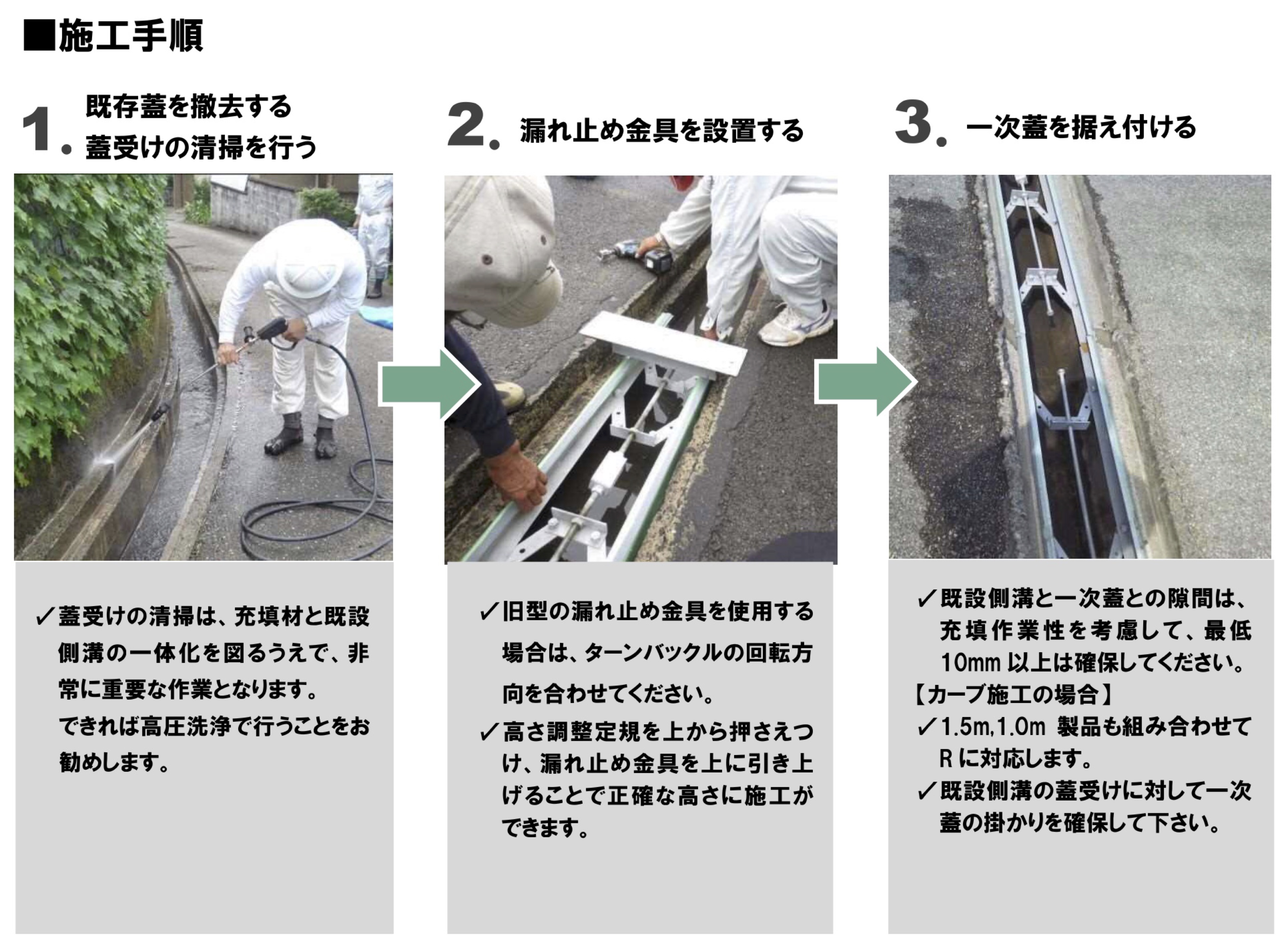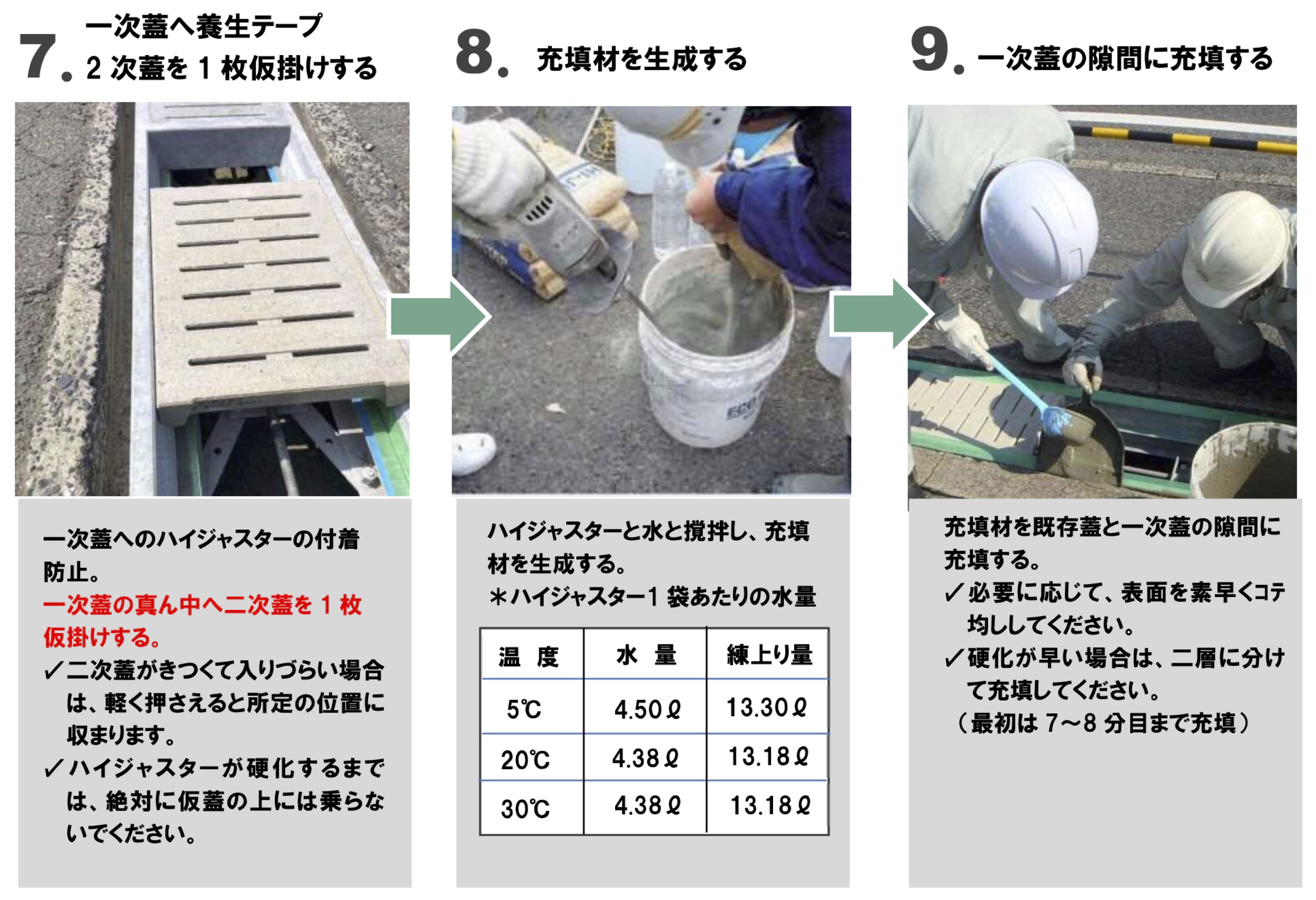 ❶ 既存蓋撤去→❷側溝清掃→❸支保工の設置→❹一次蓋設置→❺充填材の注入→❻支保工の撤去→❼二次蓋設置→❽交通開放